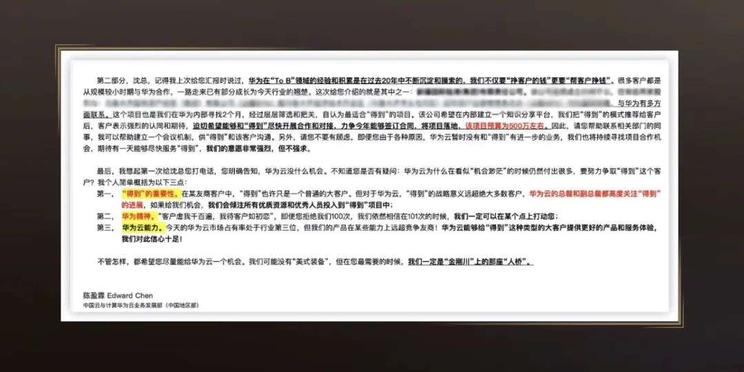 在他发给罗振宇的这封邮件中,并没有着重提及华为云技术的强大,反倒在得知得到App要做企业服务的时候,愿意花2个月,在内部优先为得到找寻一个项目预算500万的客户。