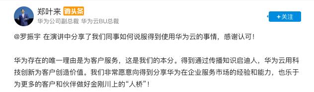 而在一天后,华为公司副总裁、华为云BU总裁郑叶来也正式回应:“@罗振宇 在演讲中分享了我们同事如何说服得到使用华为云的事情,感谢认可!华为存在的唯一理由是为客户服务,这是我们的本分。得到通过传播知识启迪人,华为云用科技创新为客户创造价值。我们非常愿意向得到分享华为在企业服务市场的经验和能力,也乐于为更多的客户和伙伴做好金刚川上的“人桥”!