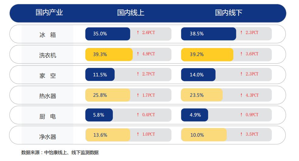 根据中怡康数据,海尔今年上半年公司冰箱、洗衣机、家用空调、热水器、厨电的线下、线上市场零售额份额均持续提升。