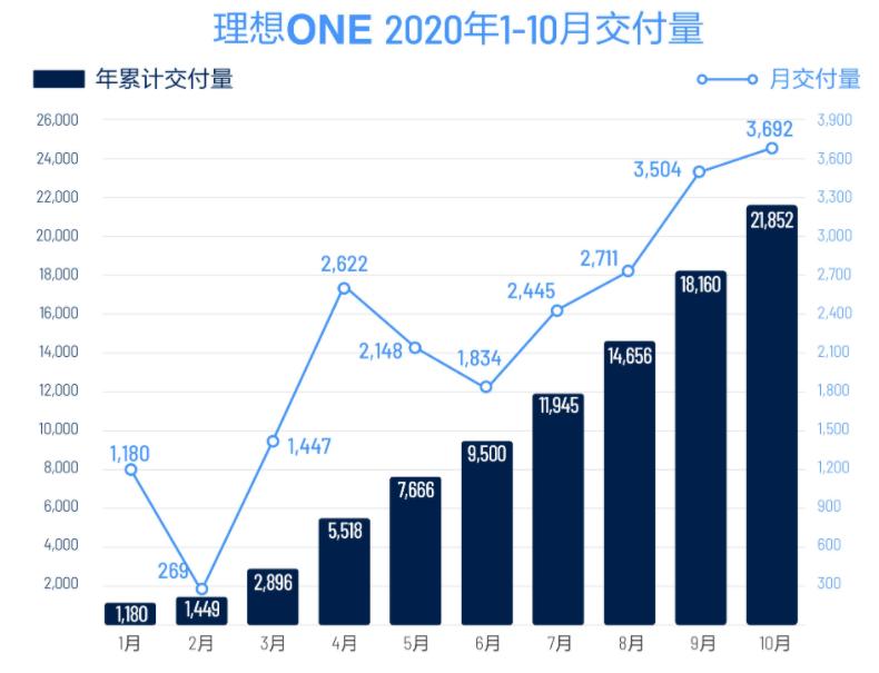 11月2日,理想汽车公布了10月交付数据。理想ONE在10月交付3692辆,连续三个月刷新单月交付量纪录。同时,10月新增定单量也创下历史新高。2020年1月至10月,理想ONE已累计交付21852辆。
