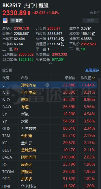 知名中概股中,蔚来涨8.96%,阿里巴巴涨2.02%,拼多多涨1.82%,名创优品涨1.05%,京东涨0.98%,百度涨0.75%,贝壳涨0.10%。