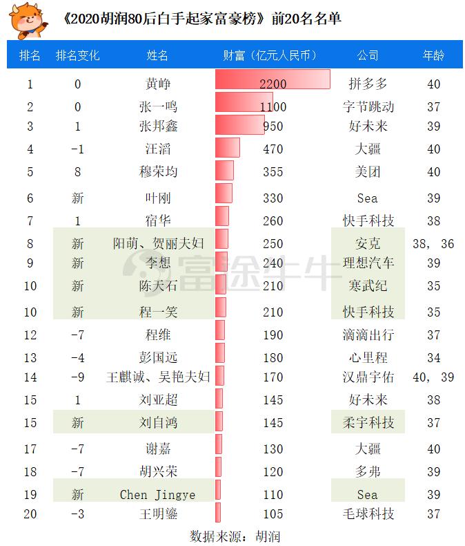 胡润研究院发布其子榜《2020胡润80后白手起家富豪榜》,这是胡润研究院连续第五次发布此榜单,财富计算的截止日期为2020年8月28日。