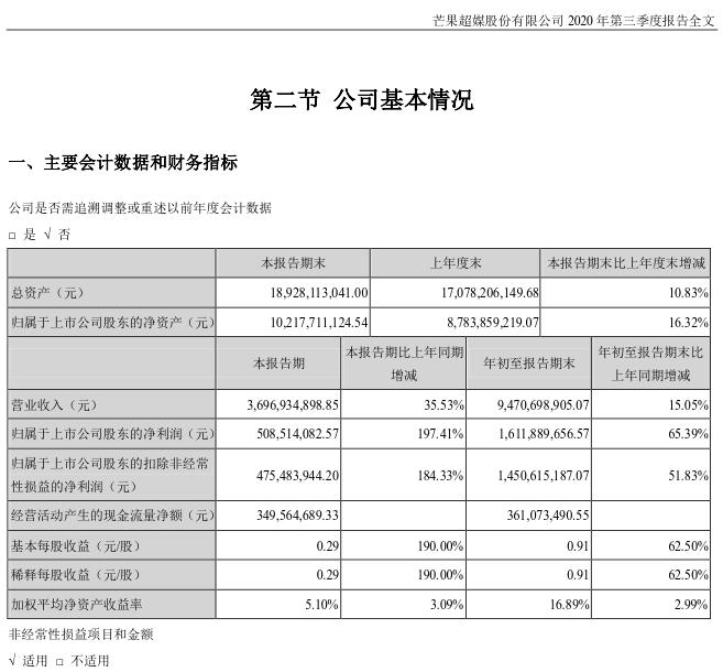 芒果超媒的表现是可预期的。今年夏天最热门综艺《乘风波浪的姐姐》已经达到现象级节目的程度,给芒果超媒带来招商、会员等多重收入大部分体现在Q3财报里,导致Q3的营业收入同比大增35.53%至36.97亿元;实现净利润5.09亿元,同比增长197.4%。