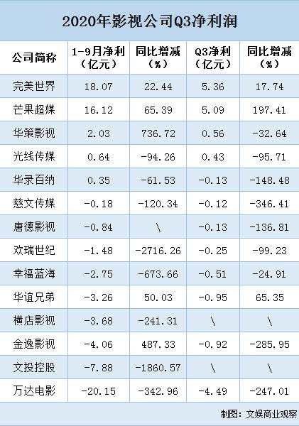 Q3财报中还有比较令人失望的是万达电影。Q3实现营业收入12.41亿元,同比下降69.2%;实现净利润亏损4.49亿元,同比下降247%;2020年前三季度总体亏损达到了20.19亿元,成为影视公司中亏损最为严重的。