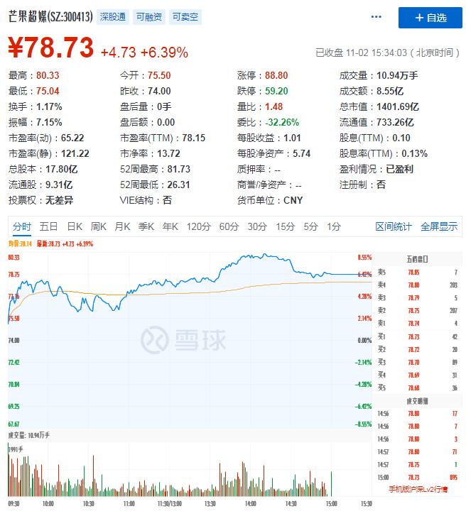 有了业绩的支撑,芒果超媒的股价在影视股里面也是最坚挺的。三季报公布前后,芒果超媒的股价迎来了疯狂的上涨,累计涨幅超过20%,一度突破80元每股的大关,总体市值已经逼近1500亿元,相当于光线+华谊+万达+华策+慈文等影视公司的市值总和。