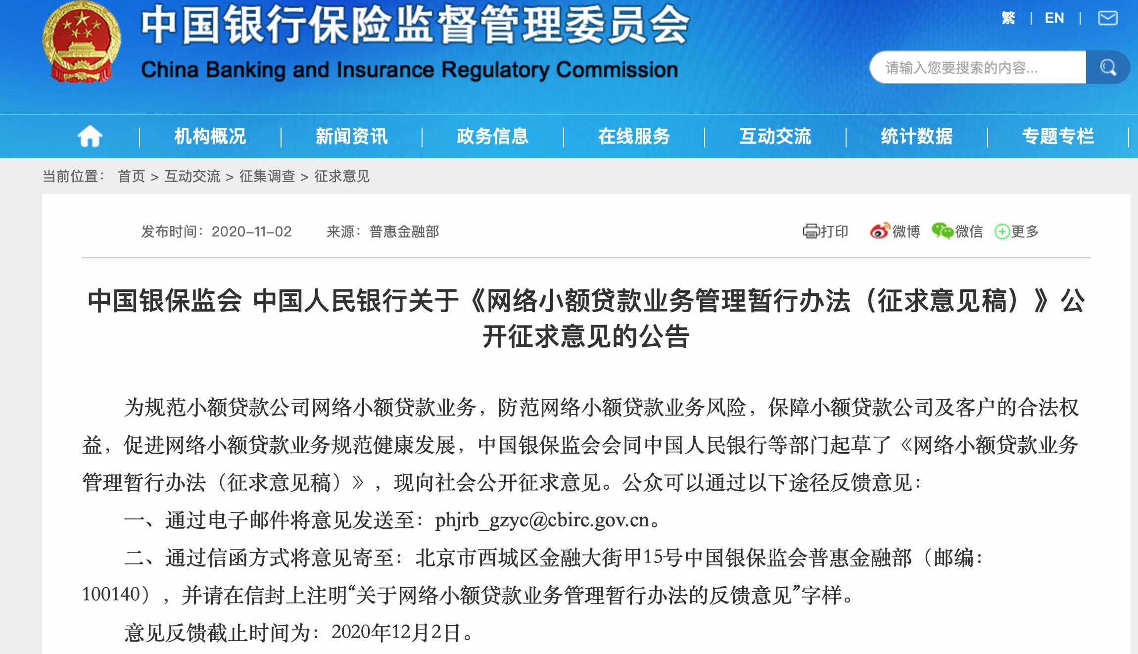 当日晚间,中国银保监会、 中国人民银行就《网络小额贷款业务管理暂行办法(征求意见稿)》公开征求意见。