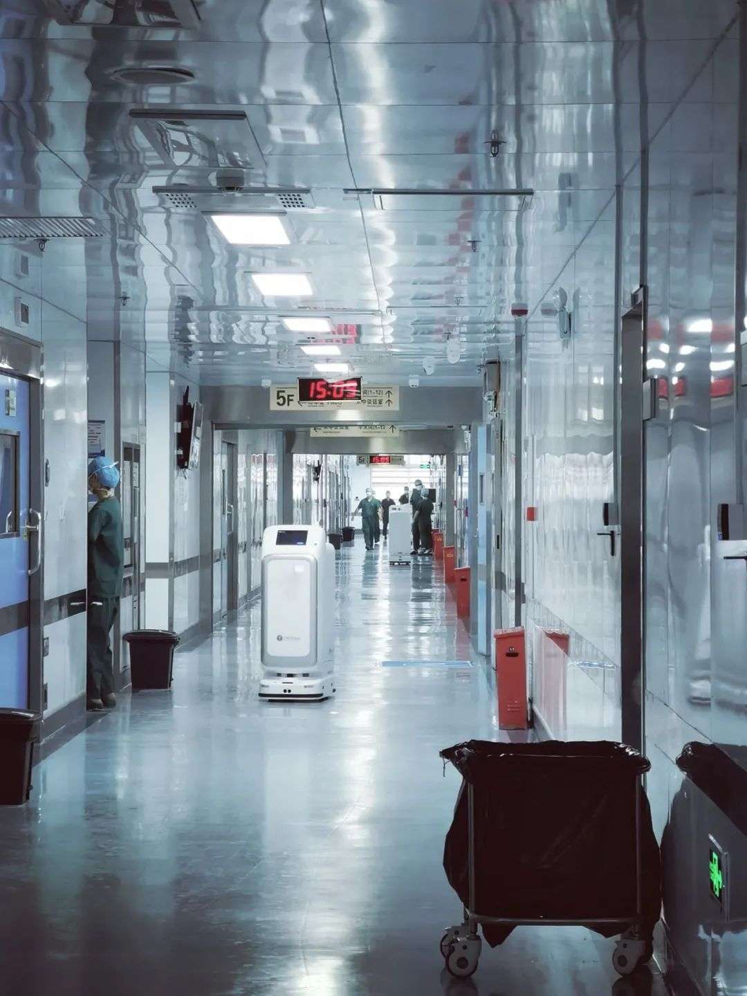 长长的白色走廊上,5G机器人正在进行一次彻底杀毒,它们可以24小时不间断地工作,做流行病史调查、量体温、配送手术耗材和血液样本。