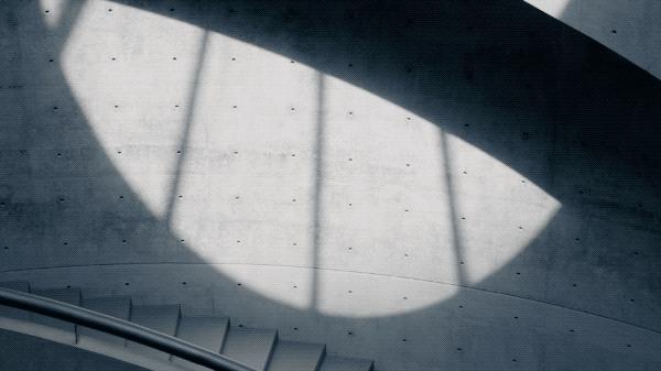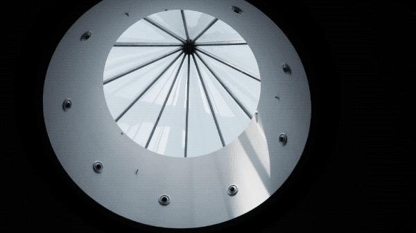 美术馆的顶部,是一个透光的弧形玻璃穹顶。自然光洒进中庭,随着时间变换,光斑会点缀在楼梯的不同位置上,楼梯的明暗也发生变化。顺德的地理位置正好就在北回归线上,每年夏至日时,太阳便会90度垂直射入穹顶,像一条直入云端的时空隧道。