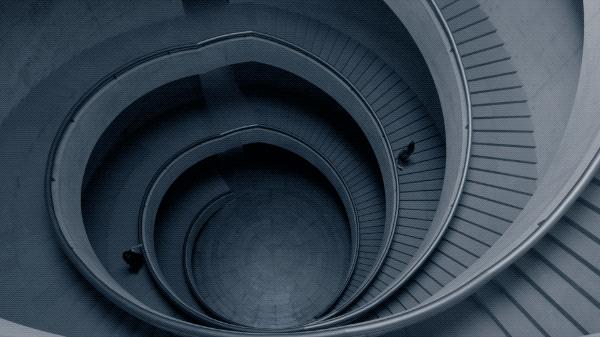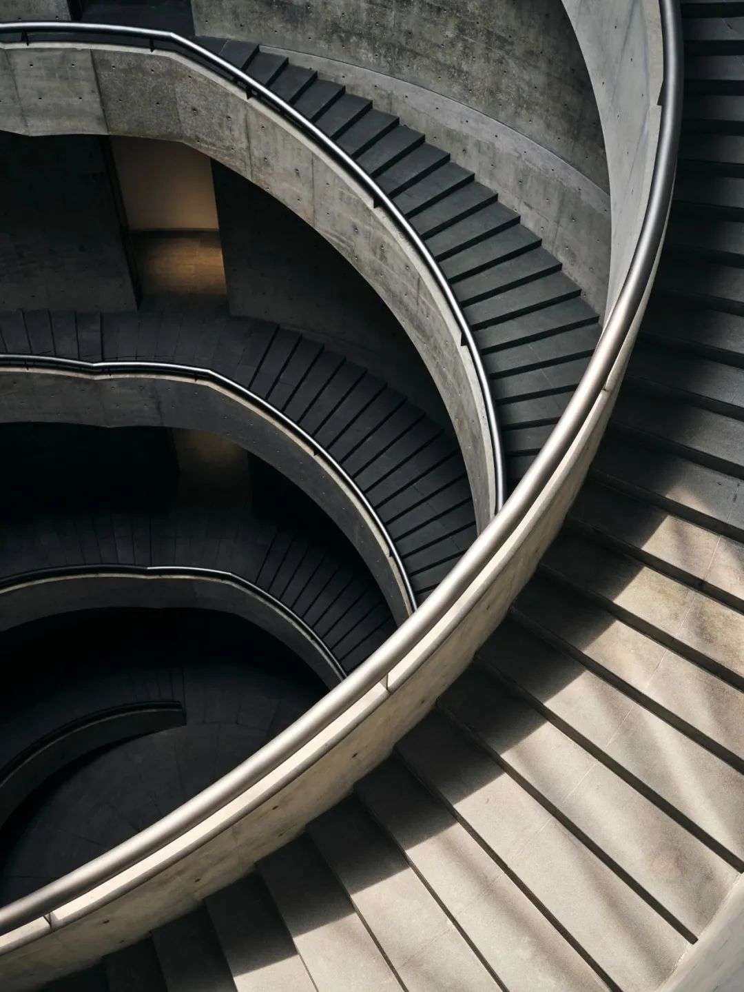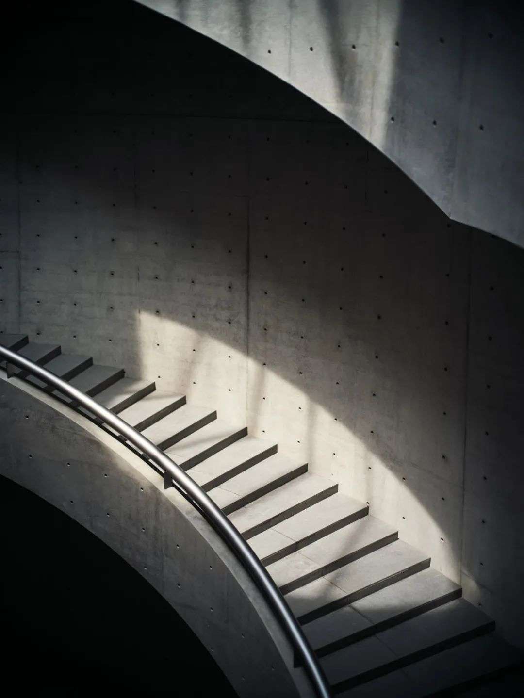 穿过大堂的环形走廊,一转身就进入了建筑中央。空旷而自由的空间,只有天顶的光洒下来,不经人事,心无杂念。这是世界上第一个混凝土双螺旋阶梯,像两条并行蜿蜒、永不交汇的河。
