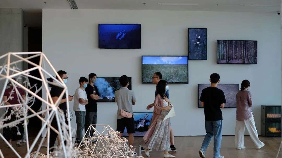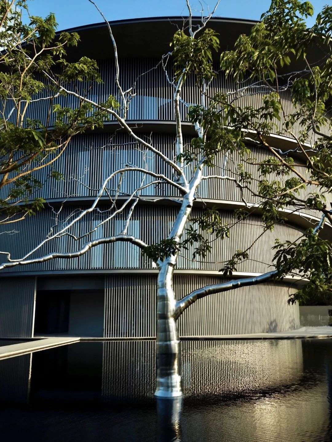 走在上面,除了可以看到水面上被风吹动的建筑倒影,还有一旁美国艺术家洛克希·潘(Roxy Paine)的作品,一棵银色的大树。“它是死的,但又充满活力,与美术馆中西融合。”