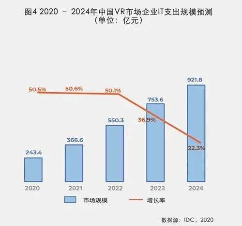 调研分析机构IDC在《VR产业研究白皮书》中预测,商用VR市场未来几年将持续增长,到2024年,中国商用VR市场规模将达到921.8亿,约为2020年的3.8倍,教育、零售、制造、建筑及服务业成为VR市场主要力量。