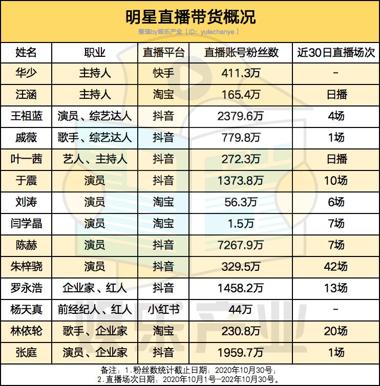 娱乐产业(ID:yulechanye )从多家直播平台,选取了目前仍活跃在直播带货领域的部分典型性明星。他们有的转换风格,组建专业团队准备长线营业,如刘涛;有的发挥特色,开拓直播场景新模式,如汪涵;有的逆势入局,团队作战渐入佳境,如罗永浩。同时,每个人的直播方式也不一样,为了维持稳定销售额,有的一个月直播竟高达42次,而有的一个月只直播一两次,销售额便上亿。通过复盘他们的带货方式和运作,挖掘他们在直播带货这片红海与专业主播厮杀的核心竞争力。