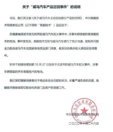 这种说法得到了一位威马内部人士的认可,该内部人士告诉车市物语,威马发布的回应并没有说力学研究所涉事车辆搭载的是中兴高能的电芯,只是说对搭载中兴高能电芯的车辆进行召回,外界将两者搞混了。