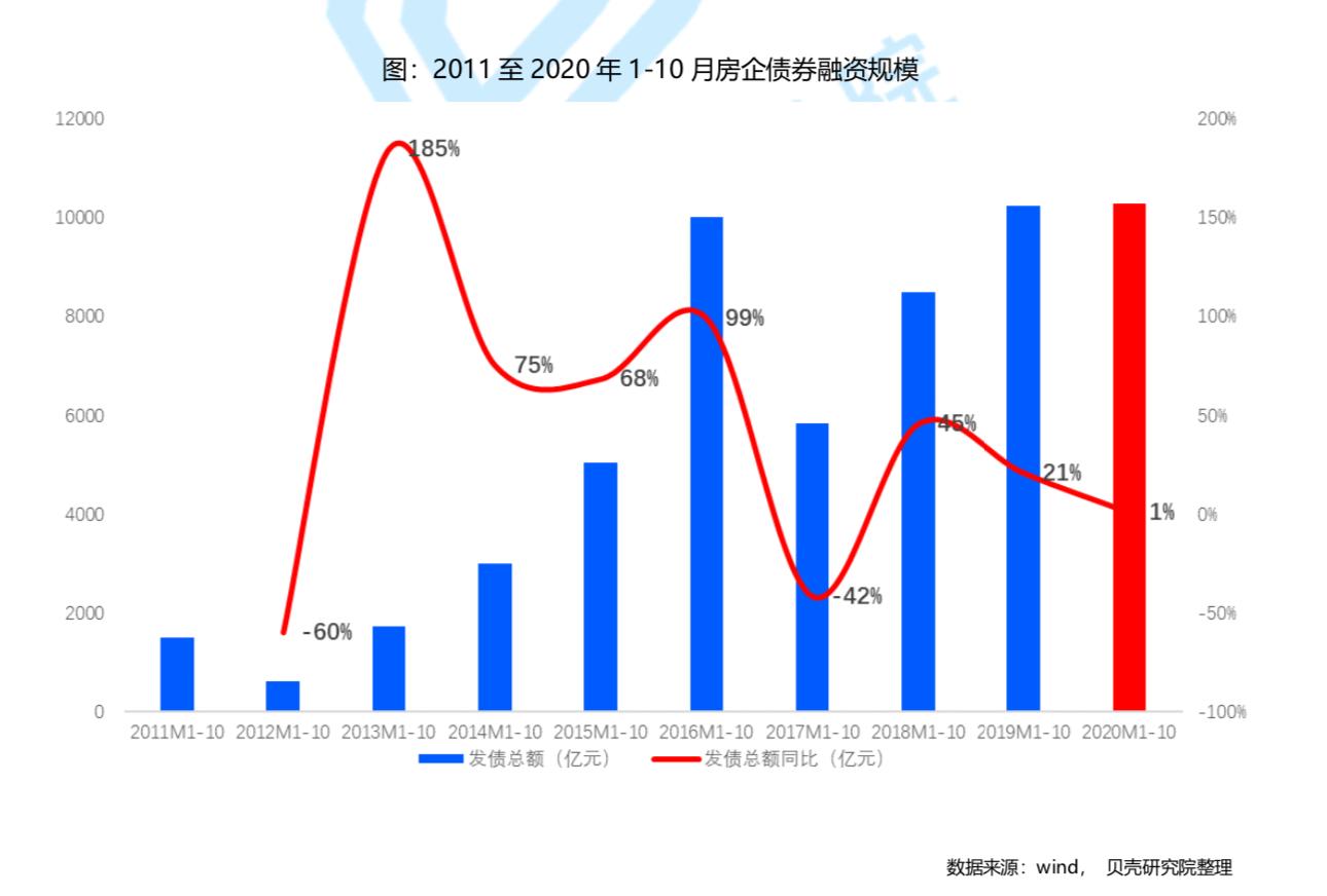 贝壳研究院近日发布的《10月房企融资报告》显示,1-10月房企境内外债券融资累计约10283亿元,同比微增1%,该增幅较2019年同期大幅收窄20个百分点。