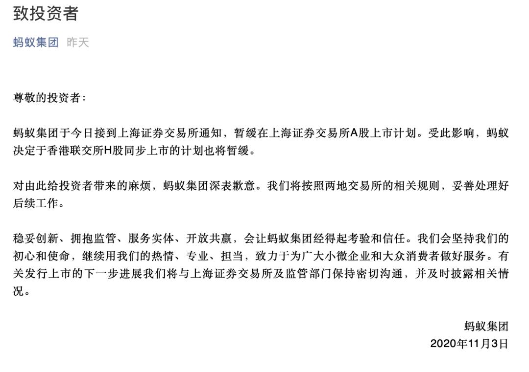 昨晚,蚂蚁回应两地暂缓上市表示,“对由此给投资者带来的麻烦,蚂蚁集团深表歉意。我们将按照两地交易所的相关规则,妥善处理好后续工作。”