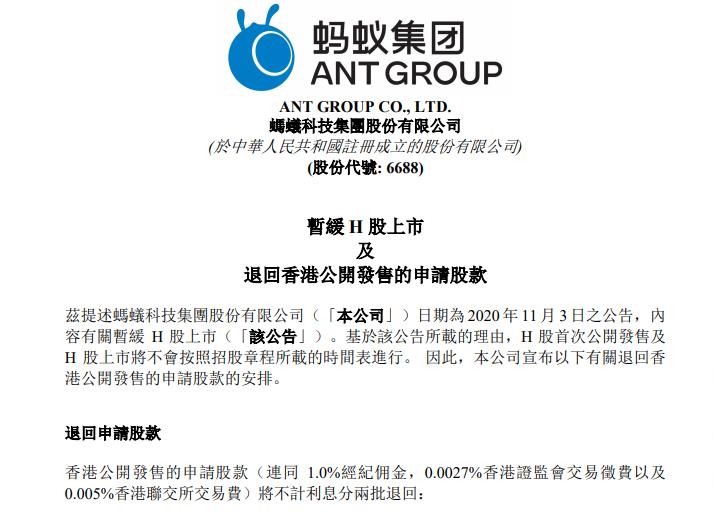 4日早上,蚂蚁集团在港交所公告,暂缓H股上市及退回香港公开发售的申请股款。香港公开发售的申请股款(连同1.0%经纪佣金,0.0027%香港证监会交易征费以及0.005%香港联交所交易费)将不计利息分两批退回。