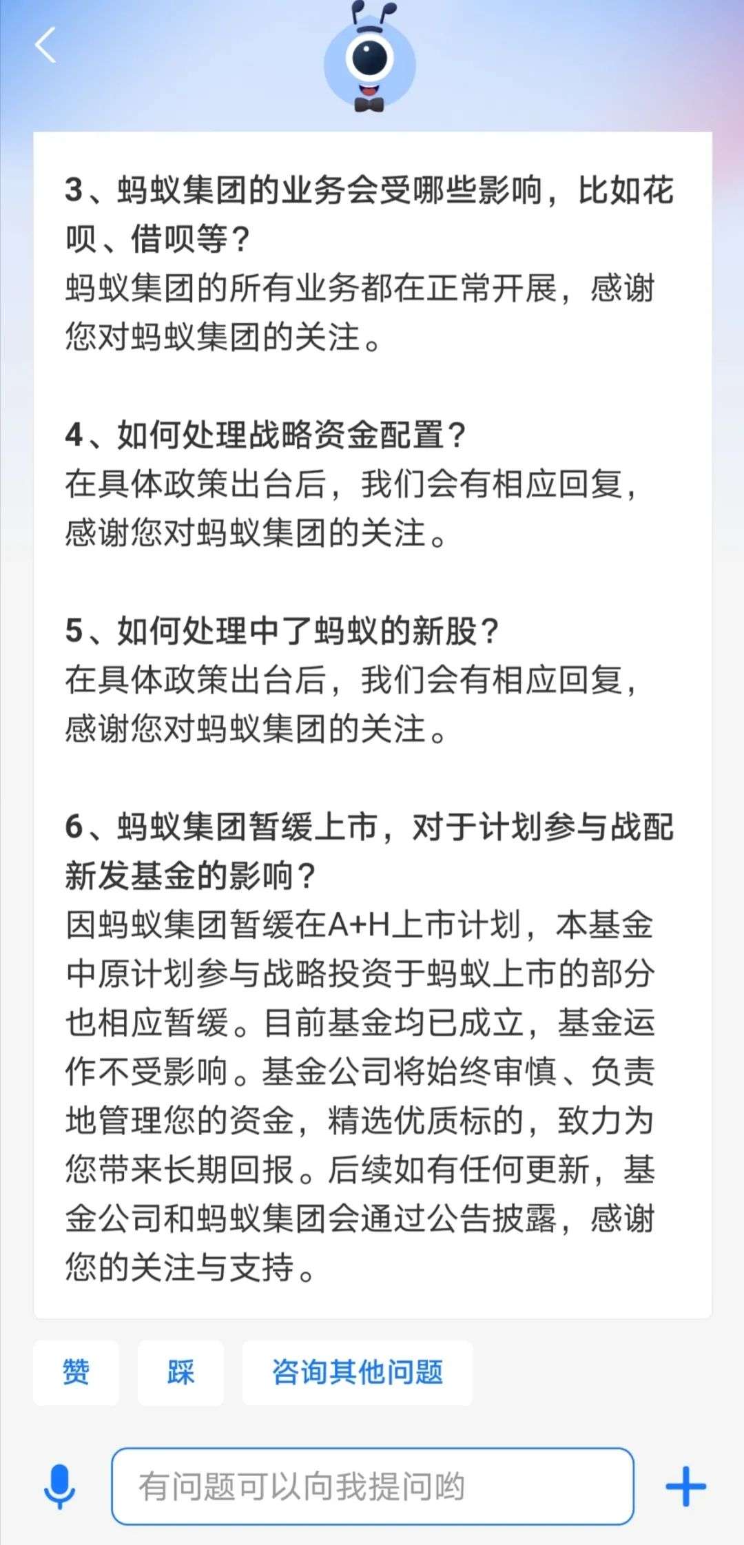 支付宝客服同时表示,“基金公司将始终审慎、负责地管理您的资金,精选优质标的,致力为您带来长期回报。后续如有任何更新,基金公司和蚂蚁集团会通过公告披露。”