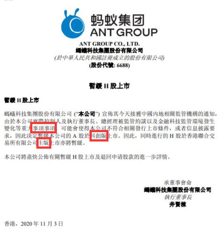昨晚,蚂蚁集团在港交所公告:今天接获中国内地相关监管机构的通知,由于本公司实际控制人及执行董事长、总经理被监管约谈以及金融科技监管环境发生变化等重大事项,可能会使得本公司不符合相关发行上市条件,或者信息披露要求,因此决定暂缓本公司的A股于科创板上市。因此,同时进行的H股于香港主板上市亦将暂缓。本公司将尽快公布有关暂缓H股上市及退回申请股款的进一步详情。