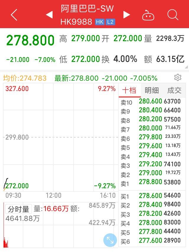 4日港股开盘,阿里巴巴(09988.HK)大跌超过9%,截至发稿收窄至7%。
