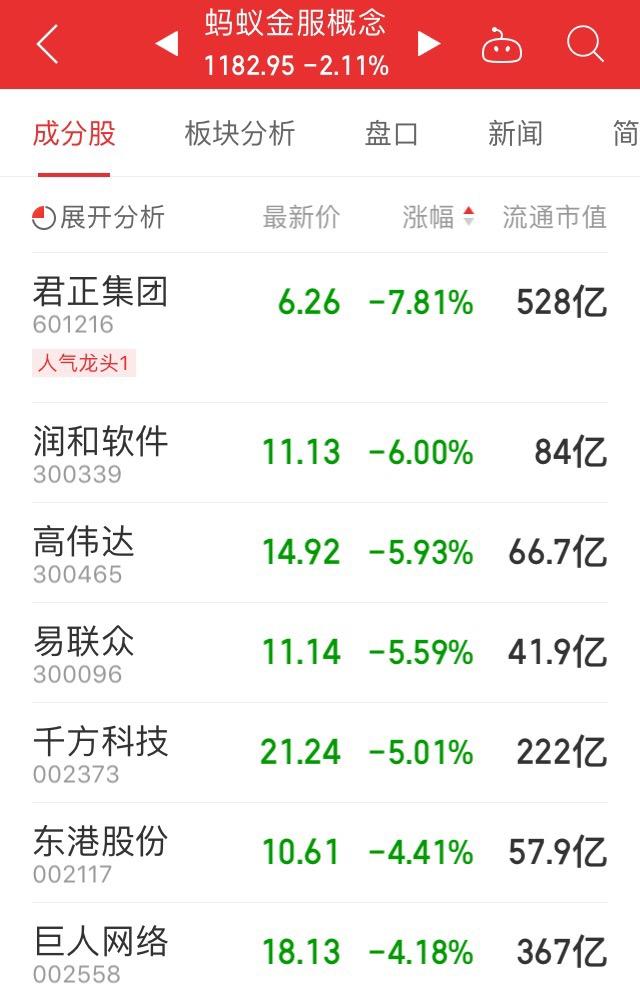 A股蚂蚁金服概念指数大跌逾2%,多只股票跌幅超过5%。