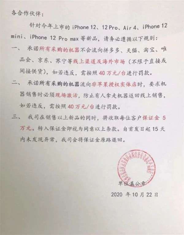 10 月 23 日,根据蓝鲸财经报道,苹果的一家线下经销商通知合作伙伴,针对刚刚上市的 iphone12 系列新品,禁止流向拼多多、天猫、淘宝、苏宁、京东、唯品会等线上渠道以及海外市场,否则需要按照每台 40 万元进行罚款。