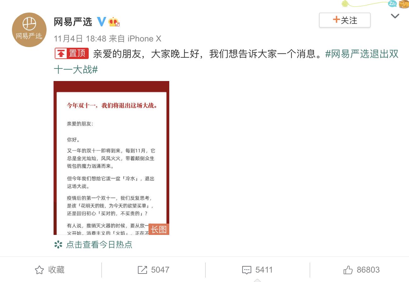 36氪获悉,网易严选官方微博表示,将退出今年双十一。网易严选称,“我们要退出这个鼓吹过度消费、为销售数字狂欢的双十一。”网易严选还称,今年双十一不发战报,不为销售额开庆功宴。今年双十一不做复杂优惠玩法,但“搞定了”全年最大力度补贴。网友@瓜皮1026表示,“好家伙,这风向把控的还挺准呀。”