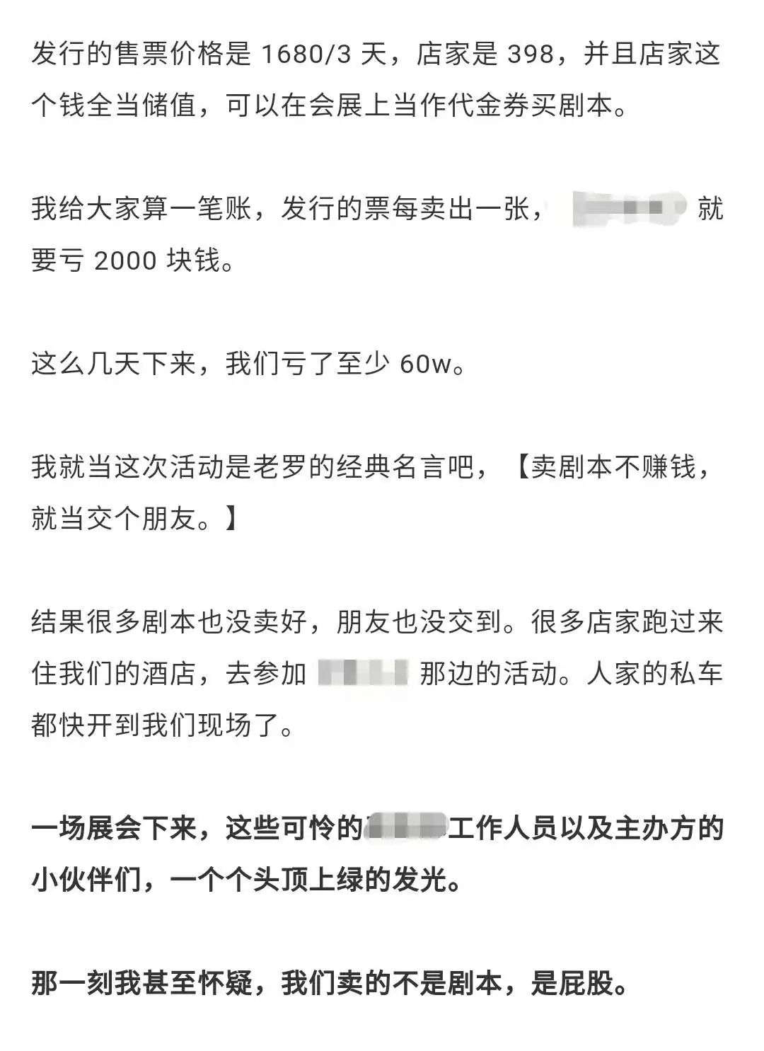 一般来讲,展会只出售店家和发行两种模式的门票。发行在销售推广剧本时也只对拥有店家门票的人员开放测试。同时参加展会的店家必须提供营业执照和门店地址才能购买,这也是一种防止盗版流出,保护版权的措施。为了能够多玩几个剧本,挖掘到展会质量最好的本子,店家们常会通宵玩本,发行们为了卖出更多的剧本亦是如此。