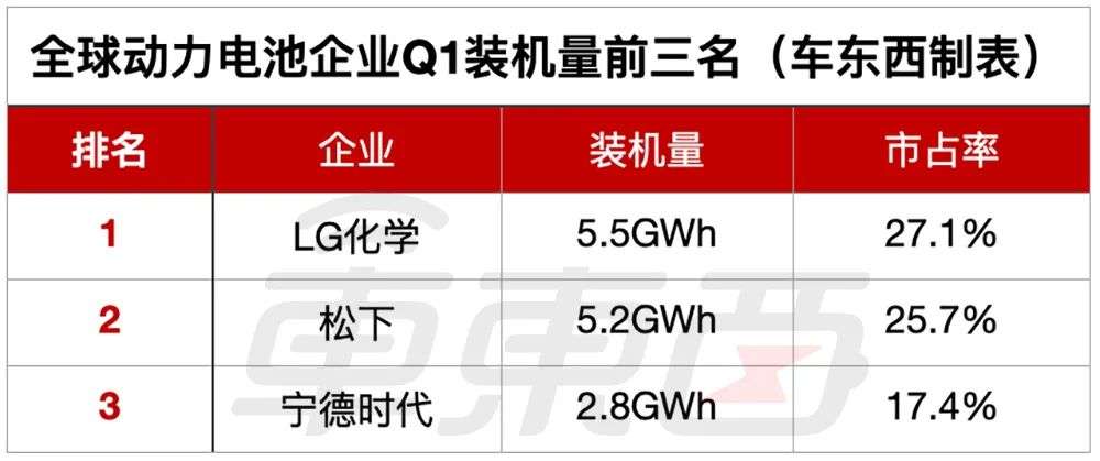 今年第一季度,LG化学以27.1%的市场份额击败了实力强劲的松下和宁德时代,装机量也激增120%达到了5.5GWh,成为了全球市场占有率第一的动力电池企业。松下和宁德时代分别以25.7%和17.4%的市场占有率位列第二和第三,装机量分别为5.2GWh和2.8GWh。