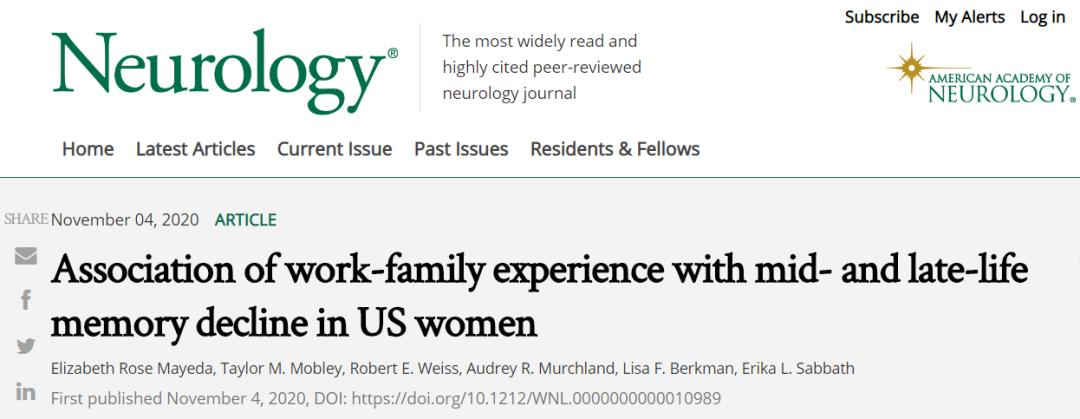 [3] Mayeda, E. R.,Mobley, T. M., Weiss, R. E., et al. , 2020. Association of work-family experience with mid- and late-life memory decline in US women. Neurology. <https://doi.org/10.1212/WNL.0000000000010989>