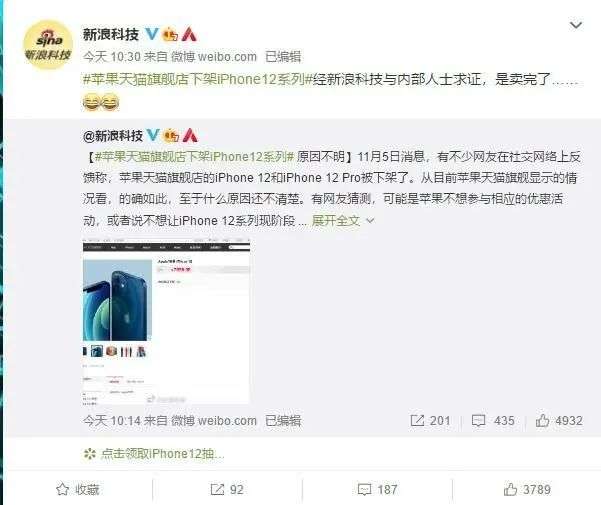但在发布新品之余,苹果也没有忘记远在中国的双十一。今天,苹果天猫旗舰店突然下架了发布没多久的iPhone 12和iPhone 12 Pro。在证券时报的调查下,天猫官方做出了“有惊喜”的回应,随后秒删微博,但新浪科技通过进一步求证后,反而宣称只是货源短缺。