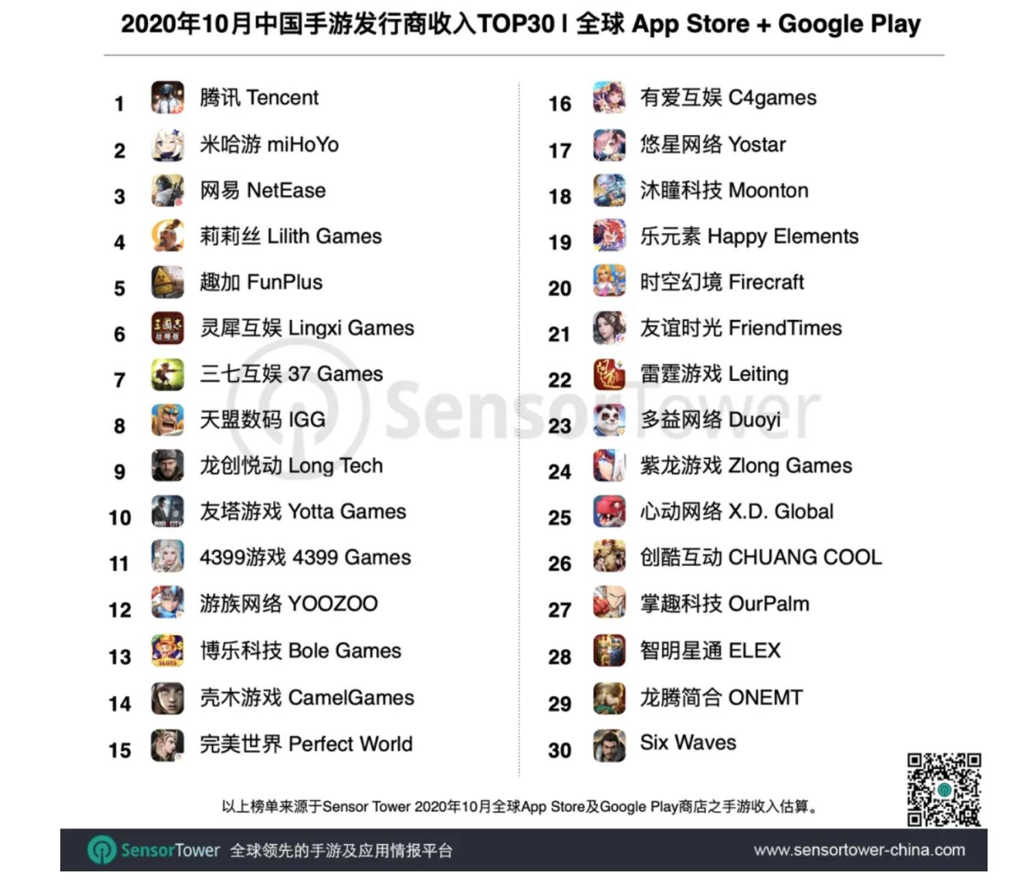 由于《王者荣耀》《和平精英》《天涯明月刀》手游等产品的贡献,腾讯仍然是10月收入榜第一的发行商。