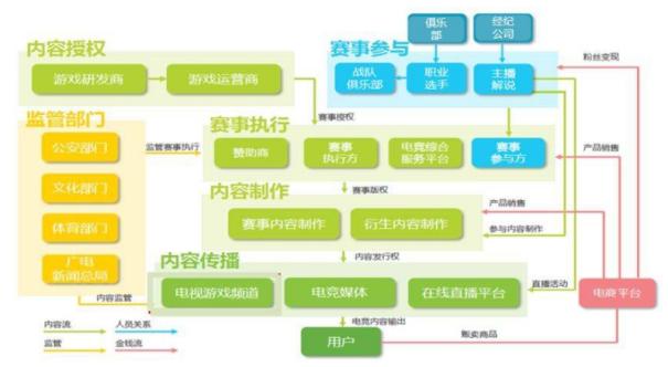 纵观产业链,上游是以游戏开发、运营为主的游戏厂商;中游则是赛事运营和电竞俱乐部;下游是与电竞内容相关的直播、媒体平台等。
