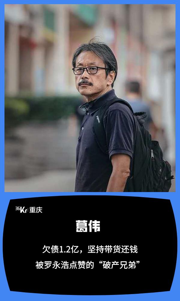 葛伟是80年代的大学生,毕业后分配到报社当记者,25岁承包报社广告业务,赚了第一桶金。36岁在重庆开发田园别墅——西郊庄园,身家最多时达到5个亿。51岁彻底破产,负债3.7亿,成了一个“老赖”,但声称“不关机、不跑路、不自杀”,一直坚持还债,现在仍欠1.2亿。2020年,57岁的他,以自媒体创业,直播带货还债。前段时间,有相似经历的锤子科技罗永浩在微博上给他点赞:虽然公司破产有可能不需要还,但是能还的都是好汉。葛伟听说后说,我死个锤子,我不能死。