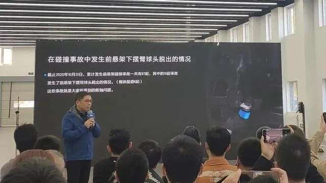 理想汽车在沟通会中的PPT显示,至今年10月底,理想汽车年内共发生97次碰撞,其中有10起事故出现了前悬架下摆臂球头从球销脱出的情况,经媒体报道的有6起,球头脱出率超10%。此即为公众所看到的断轴问题。