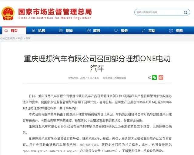 11月6日下午,国家市场监督管理总局官网公告了理想汽车的召回信息,宣布自即日起,召回生产日期在2019年11月14日至2020年6月1日的共计10469辆理想ONE电动汽车。