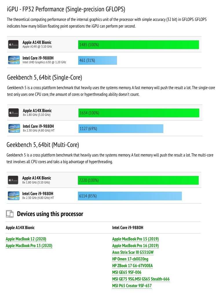 从实际跑分来看,A14X单核成绩为1634分,多核7220分。作为对比,A12Z的单核成绩为1118分,多核4657分。另外,如果横向对比MacBook Pro 16英寸(Intel Core-i9处理器)的话,后者单核和多核成绩分别为1127和6114。