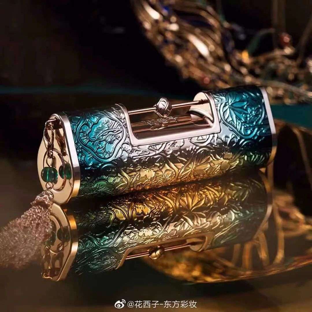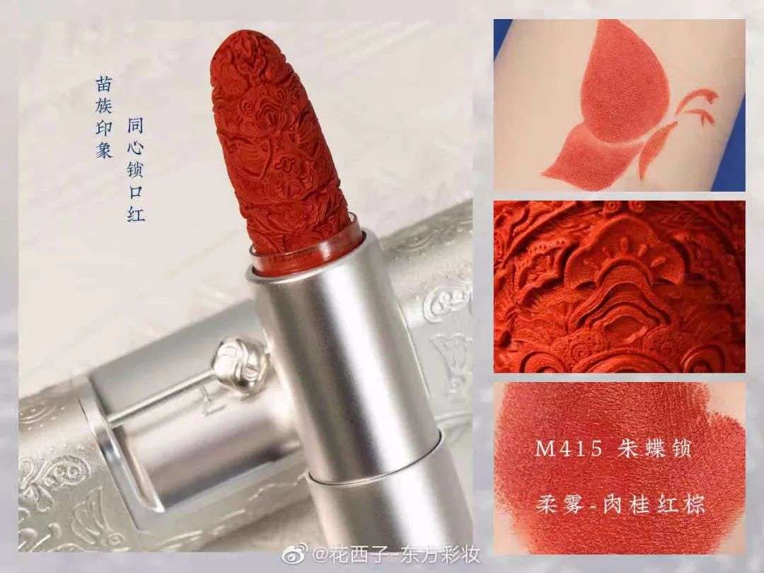 2019年4月,花西子推出将微雕工艺搬到口红膏体上的“花隐星穹雕花口红”,名字虽中二但好在细节精致。同样类型的还有去年年末浮雕既视感的“百鸟朝凤盘”,以及今年的同心锁礼盒、苗族礼盒等。