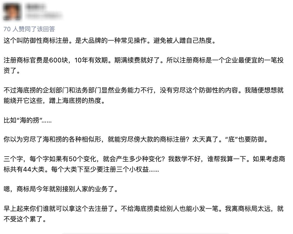 商标法领域有联合商标与防御商标的区分,即注册商标不是为了使用,而是为了防御,不让别人使用,扩大商标防御的地盘。这种注册方式成本不高,毕竟现在商标注册费用很低,才300元一个,对海底捞来说小菜一碟。