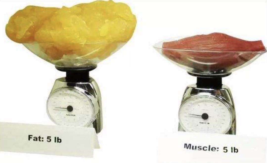 因为脂肪的密度要远远小于肌肉,同等重量的脂肪和肌肉摆在一起,脂肪的体积要大得多。