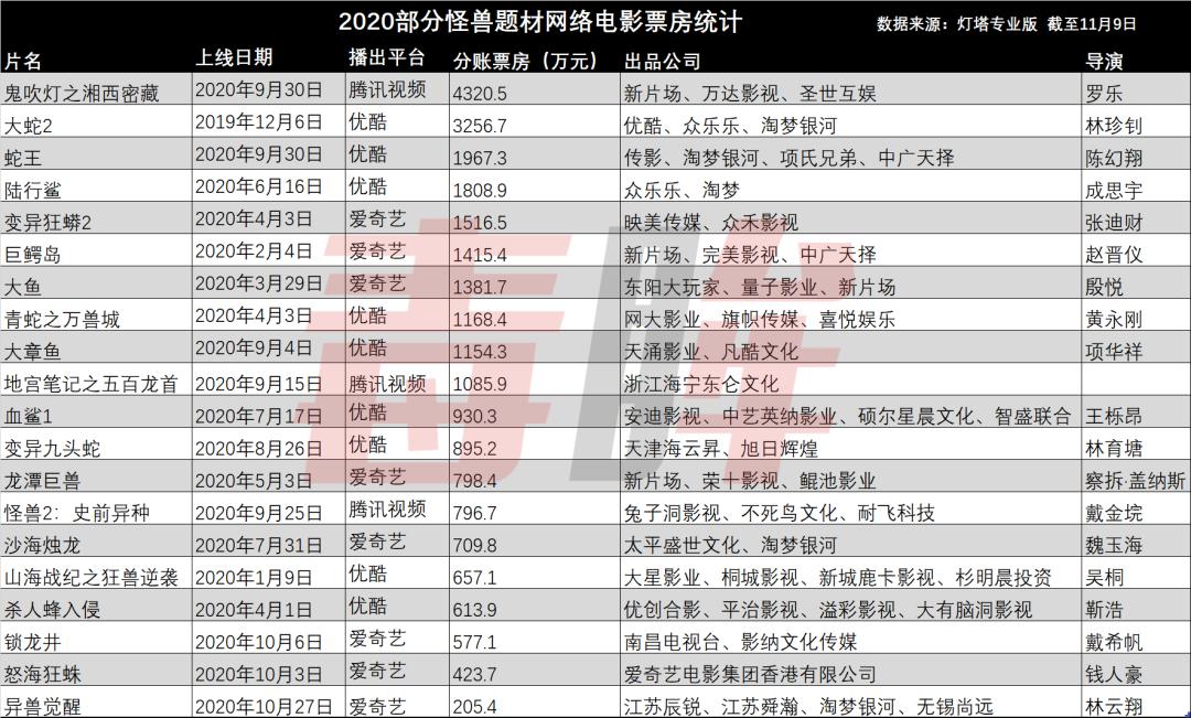 公开信息显示,2019年在广电总局备案立项的怪兽网络电影超100部;截至10月底,今年已在平台上线的怪兽网络电影也超过30部,分账方面,也有10部票房超过千万。据灯塔专业版网络电影热度榜,10月30日,爱优腾平台热度TOP10的网络电影中都包含怪兽题材。
