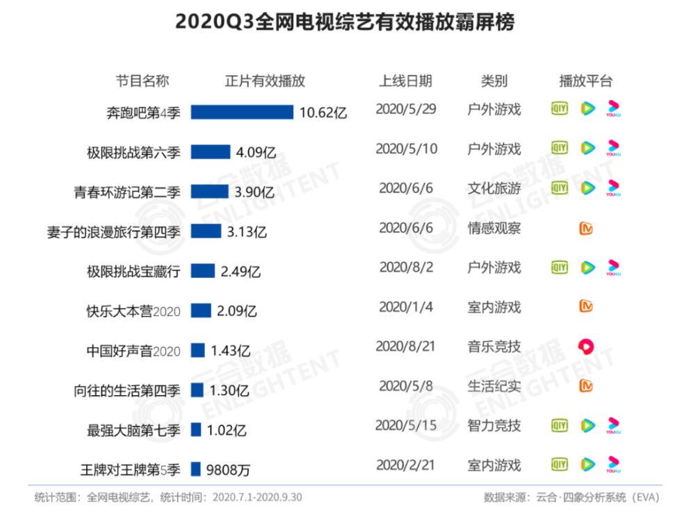纵观整个第三季度综艺市场,大盘尚且处在“复苏”期。云合数据显示,2020年Q3综艺全网有效播放量为99亿,与整体表现较平的去年同期相比,仍然有11%的下滑。