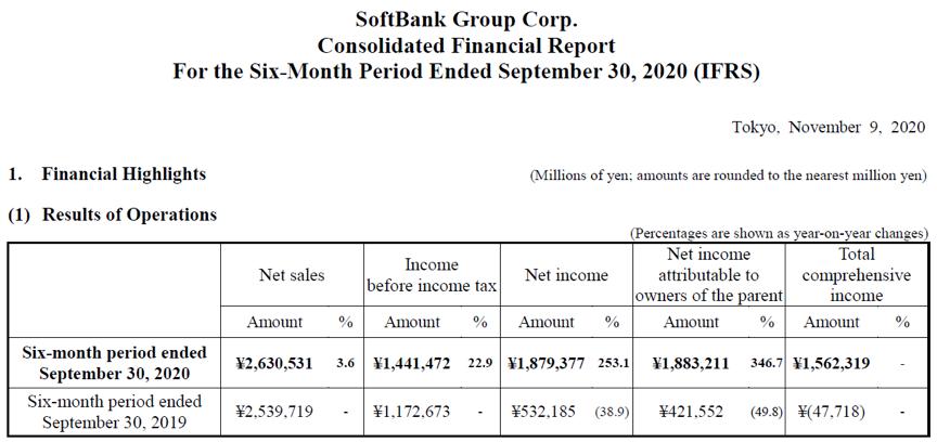 昨晚,软银集团公布了一份亮眼的季度财报——软银第二财季净销售额为2.63万亿日元,(约合人民币1669.8亿元),同比增长3.6%;净利润为1.8832万亿日元(约合人民币1196亿元),较上年同期相比大增346.7%。