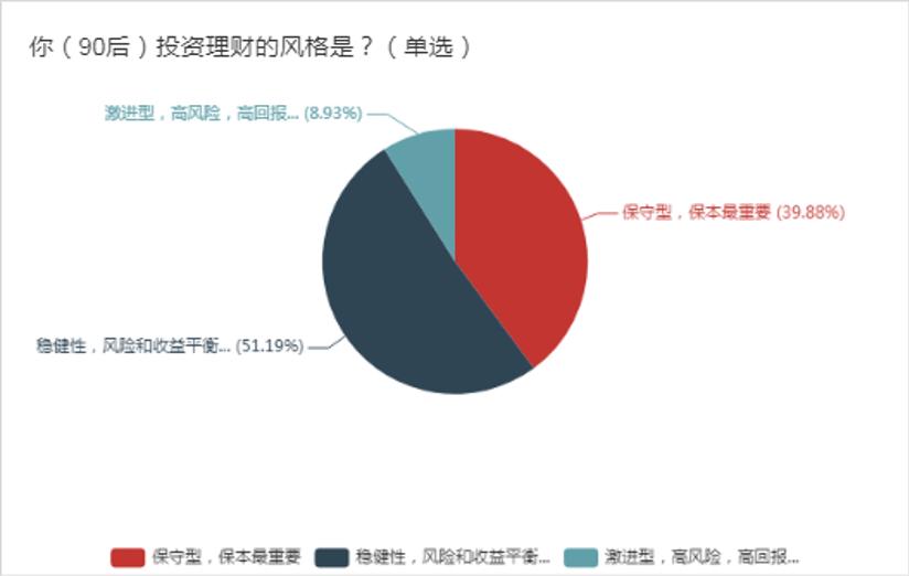 在调查问卷中,以银行理财产品的风险评估标准作为一项问题发放,39.88%的受访者要求保本也就是PR1级谨慎型,也就是最低一级;51.19%的受访者的要求中低风险,也就是PR2级稳健性;只有8.93%的人愿意选择高风险高回报的激进风格。
