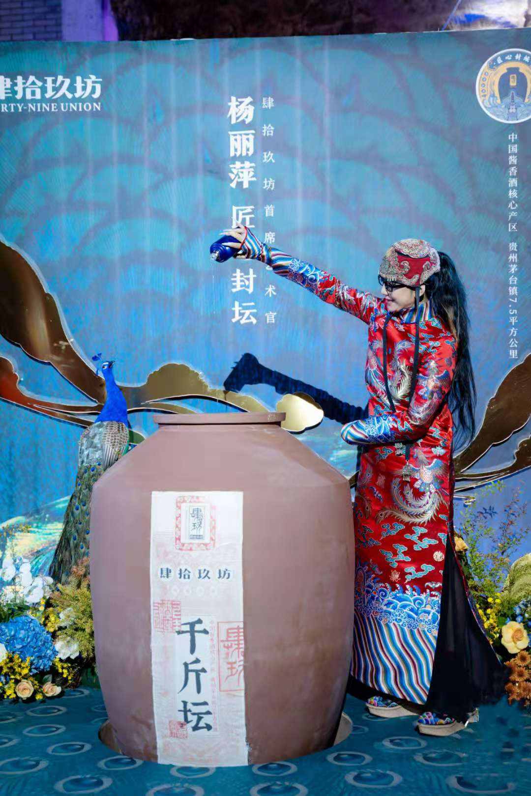 杨老师解释,她这次选的是国内酱香白酒创新品牌——肆拾玖坊,此前经过深入沟通她担任了该公司的“首席艺术官”,并推出了联名款“孔雀令”酒。在当天的封坛仪式上,杨丽萍也参与了传统的祭祀酒神、封坛大典活动,并亲手将“最后一斤”孔雀令美酒倒入酒坛,在众人的见证下封存了属于自己的“千斤坛”。