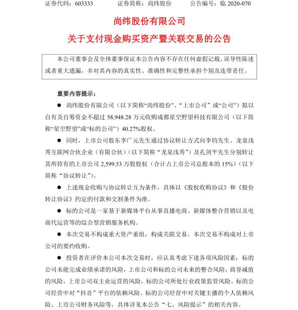 尚纬股份,一家电缆公司给出了星空野望的高溢价,是不可思议的,而这一切都离不开直播电商风口。