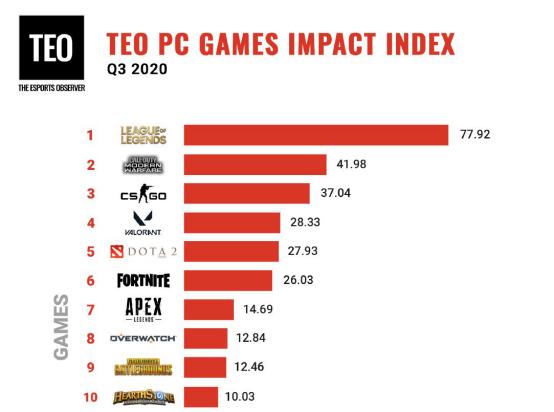 前几天,The Esports Observer发布了2020年第三季度最具影响力PC游戏排行阶梯,《英雄联盟》继续在第五个季度领跑。这款游戏问世已经超过10年,至今仍稳居全球首位。而拳头公司曾多年只拥有这一款作品,便可高枕无忧地躺着数钱。