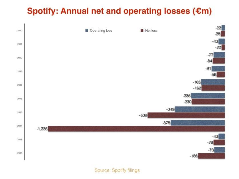 根据MBW今年5月的报道,Spotify在过去十年中的累计年度净亏损总计达26.2亿欧元。