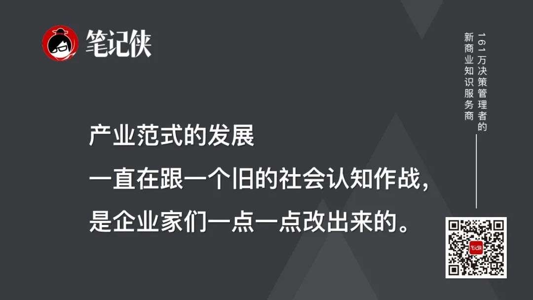 我们现在轻松地学到了这些规章制度,但是在产业发展的早期,产业范式的发展一直在跟一个旧的社会认知作战,是企业家们一点一点改出来的。
