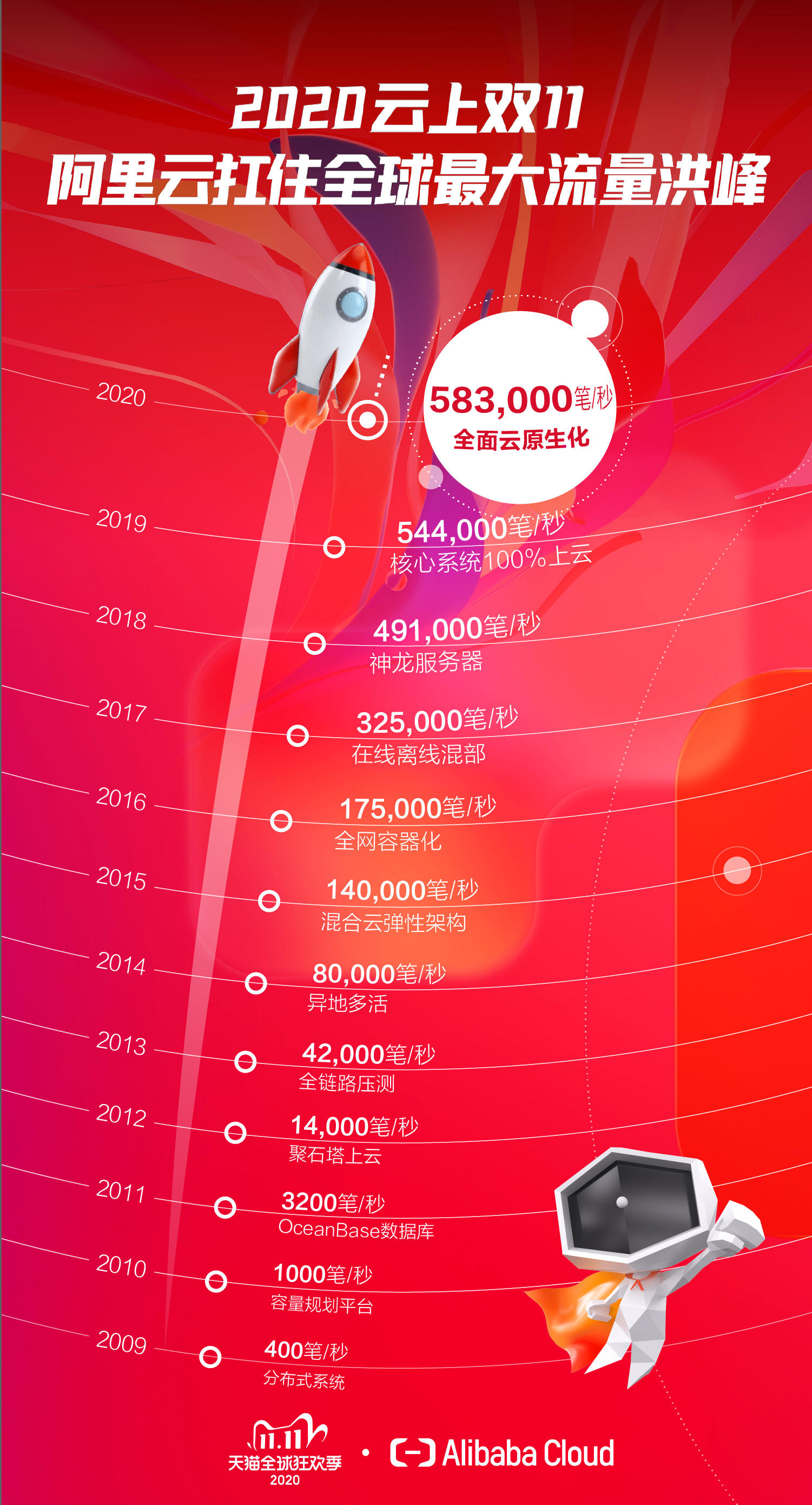 11月11日零点刚过26秒,天猫双11就迎来了流量新峰值,订单创建峰值达58.3万笔/秒。58.3万笔/秒的新纪录是2009年第一次双11的1457倍。更快更稳的同时,万笔交易的资源成本较4年前下降80%。交易额方面,11月1日至11日0点30分,2020年天猫双11全球狂欢季实时成交额突破3723亿!天猫方面预计,今年天猫双11吸引超过8亿消费者、25万品牌、500万商家共同参与,是覆盖面最广、参与度最高的一届。