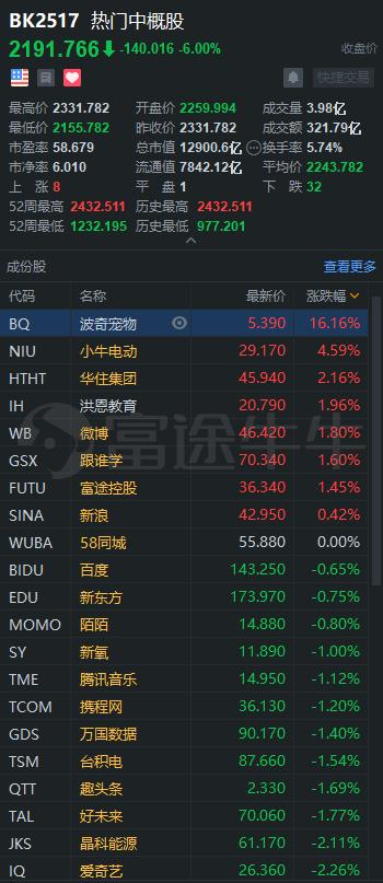 其他热门中概股方面,波奇宠物大涨16.16%,报5.39美元,但距离发行价10美元还有一定距离;小牛电动涨4.59%;华住涨2.16%;洪恩教育、微博、跟谁学、富途均涨超1%;新浪涨0.42%。